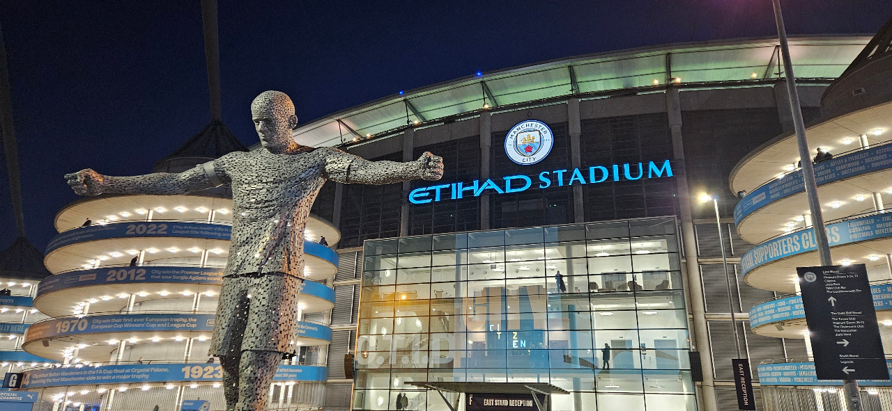 Es gibt entlang der East Stand eine ganze Allee der ehemaligen Helden. Hier Vincent Kompany. Er gilt ja auch als Kandidat für eine Nachfolge von Pep Guardiola.