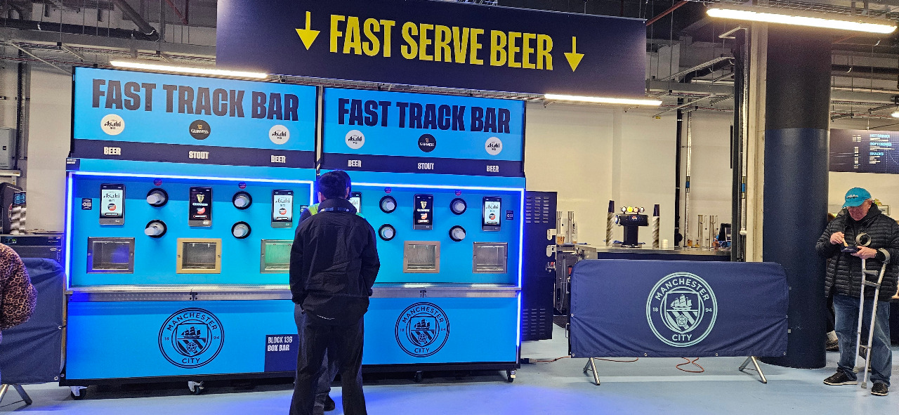 Das könnte die Zukunft im Catering der Stadien sein. Ich habe das schön öfters gesehen, zuletzt in Brighton. Man holt sich sein Bier selbst. Bezahlen mit Karte oder sogar möglichst digital, Becher reinstellen, draufdrücken, rausnehmen, trinken. Also bislang ist das Ding noch nicht in Aktion.