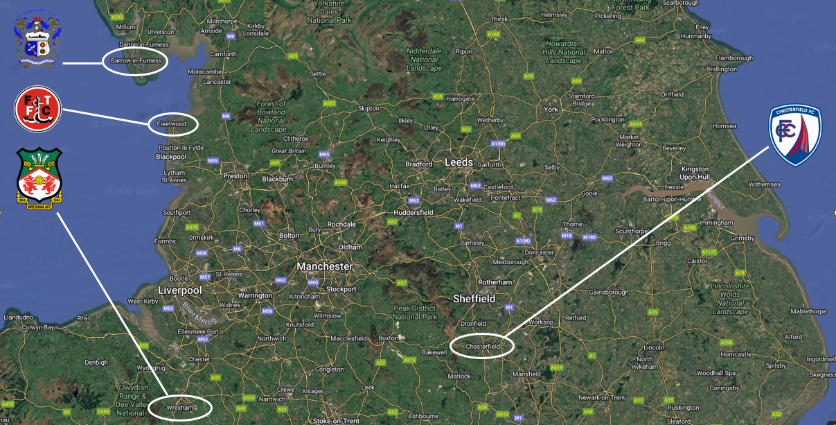 Auf der letzten Karte sieht man unter anderem noch zwei weitere abseit gelegene Clubs. Beide sind ebenfalls in der vierten Liga und richtig weit draußen. das Städtchen Barrow-in-Furness liegt am Rande des Lake Districts und ist zumindest touristisch einigermaßen attraktiv, aber mit dem Barrow AFC ist es nicht weit her. Aber auch hier gilt, da muss man hinwollen. Ähnlich ist die Lage bei Fleetwood Town. Da muß man zunächst nach Blackpool und dann mit der Tram immer an der Küste entlang hoch. Eine wunderschöne Fahrt von fast einer (!) Stunde. WOW.