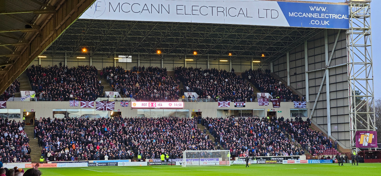 Das Match war weniger befriedigend, aber immerhin war die Stimmung deutlich besser und in der Schlußviertelstunde gar echt toll. In der ersten Halbzeit waren die Hearts seltsam passiv, die Gastgeber deutlich aktiver. Der Spitzenreiter kam einfach nicht in die Gänge und "Well" presste hoch. Immer schön vom eigenen Sechzehner fernhalten und siehe da, es klappte ganz gut. Die Hauptstädter wirkten überspielt und konzentrationslos. In der dreißgsten Minute schien man gar geschlagen, aber der VAR nahm den Treffer wegen Abseitsstellung zurück. Motherwell drückte, aber ein Treffer gelang nicht. Der Seitenwechsel änderte das Bild. Die Hearts nun mit deutlich mehr Energie, Spirit und Tempo. Man berannte das Tor der Hausherren, mit Unterstützung der proppenvollen Gästetribüne. Aber so richtige Torchancen blieben Mangelware, nach etwa zwanzig Minuten kippte die Begegnung wieder. Die Schlußviertelstunde hatte es dann in sich, die Hearts verloren komplett den Faden und retteten mit dem 0:0 den Punkt förmlich in den Schlußpfiff.
