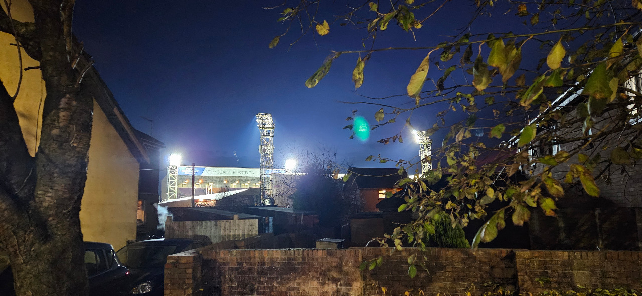 Quasi die Rückansicht des Grounds. Alle vier Tribünen sind völlig unterschiedlich hoch und nicht miteinander verbunden. Man brauchte schließlich auch Platz für die Flutlichtmasten. Jeder Stand hat seinen Namen, ich war im John Hunter Stand vorne links.