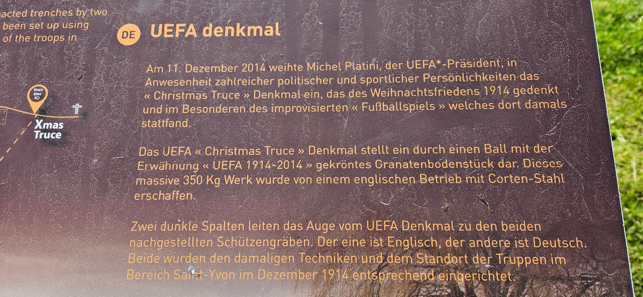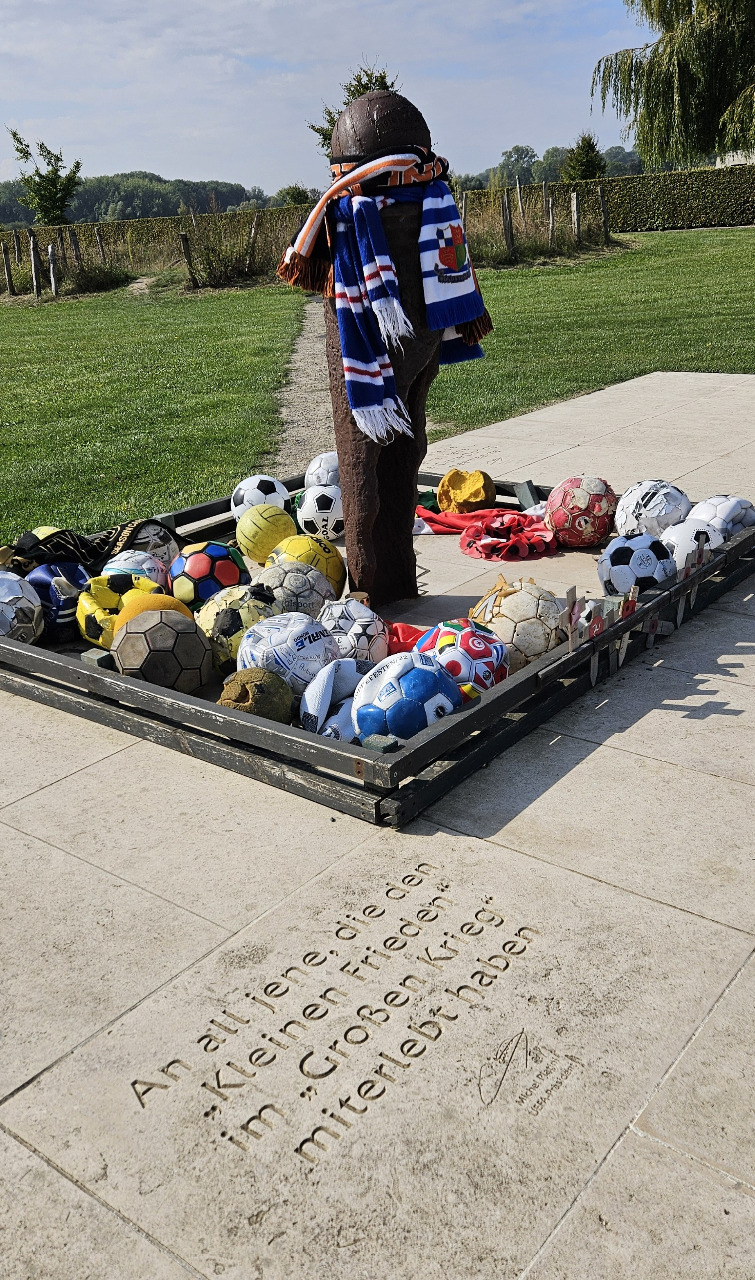 Hier an diesem Frontabschnitt standen sich deutsche und englische Truppen gegenüber. Es gibt glaubhafte Schriften und Briefe beider Seiten über diese Zeit, als die Waffen schwiegen. Man traf sich dann zu bestimmten Zeiten im Niemandsland, also irgendwo zwischen den Schützengräben und Stacheldrahtverhauen. Zunächst tauschte man Kleinigkeiten, zeigte sich gegenseitig Bilder der Familien und beerdigte die Toten. Irgendwann kam es dann zu diesem Spiel, dem Fussballspiel. Es war natürlich nicht organisiert, sondern vermutlich eher spontan. Es ging auch nicht um Sieg oder Niederlage. Halt, es gab nur Sieger. Gewonnen hat ein Stück Menschlichkeit inmitten dieses großen Krieges.