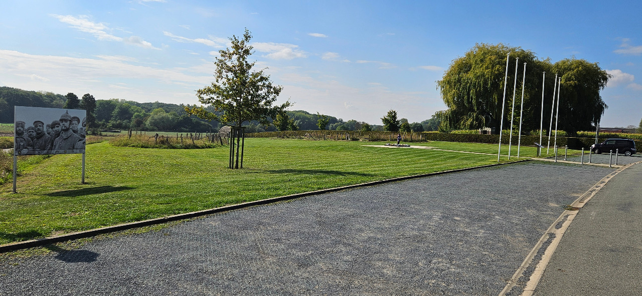 Hier nochmals der Gesamtüberblick. Etwas im Hintergrund die Nachbauten der Stellungen, weiter rechts der Friedhof mit dem kleinen Tümpel. Heute ist alles friedlich. Wie steht es schon in der Bibel: Für jedes Geschehen unter dem Himmel gibt es eine bestimmte Zeit; es gibt eine Zeit zum Lieben und eine Zeit zum Hassen, es gibt die Zeit des Krieges, es gibt die Zeit des Friedens. Prediger 3, Vers 8.