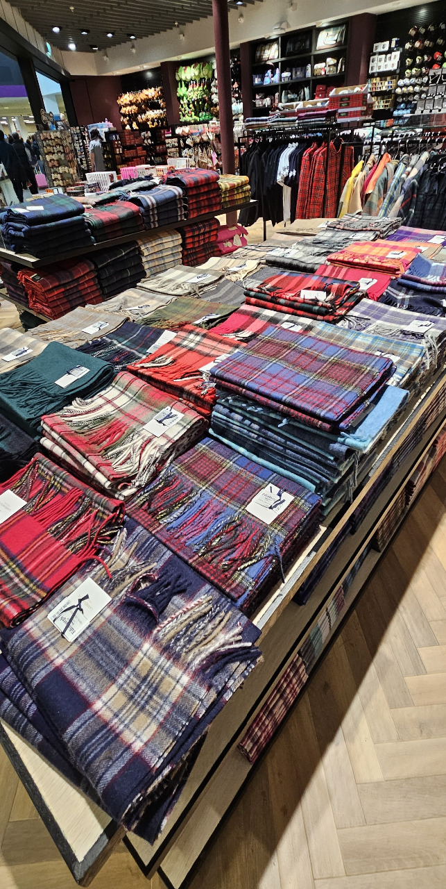 Ebenso schwer beliebt sind Mitbringsel im typischen Karomuster, Tartan genannt. Da nun nicht jeder Tourist unbedingt daheim einen Kilt tragen möchte, gibt es da wesentlich günstigere Angebote. Der absolute Renner sind dabei Schals. Läden mit diesem Angebot finden sich überall, nicht nur in den Touristenfallen. Die verschiedenen Farbmuster gibt es schon seit Jahrhunderten, dass jede Familie oder Clan sein eigenes Muster hat, dagegen noch nicht so lange. Es gehört zum Mythos Schottlands, aber erst so seit etwa 110 Jahren kann man "sein" Muster registrieren lassen. Egal, auf jeden Fall gibt auch hier noch Preisunterschiede. Je nach Material beginnt man bei umgerechnet 20,-- €, nach oben fast keine Grenzen.