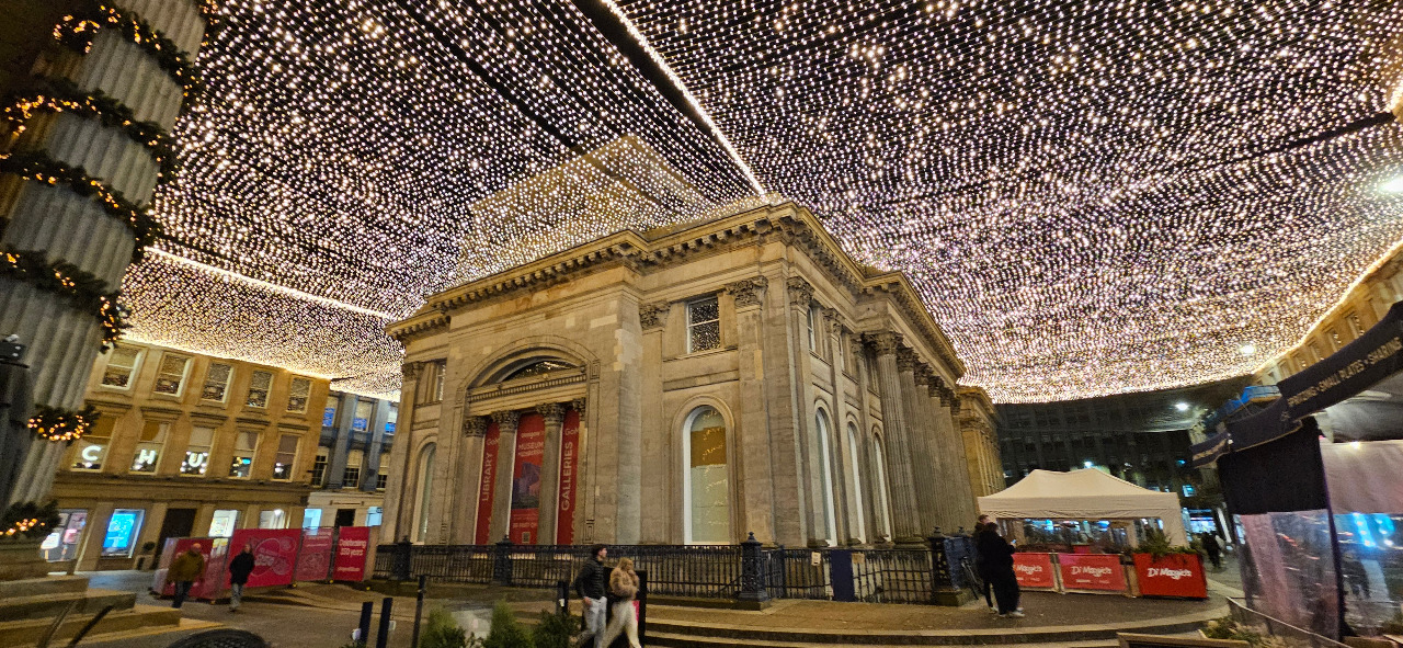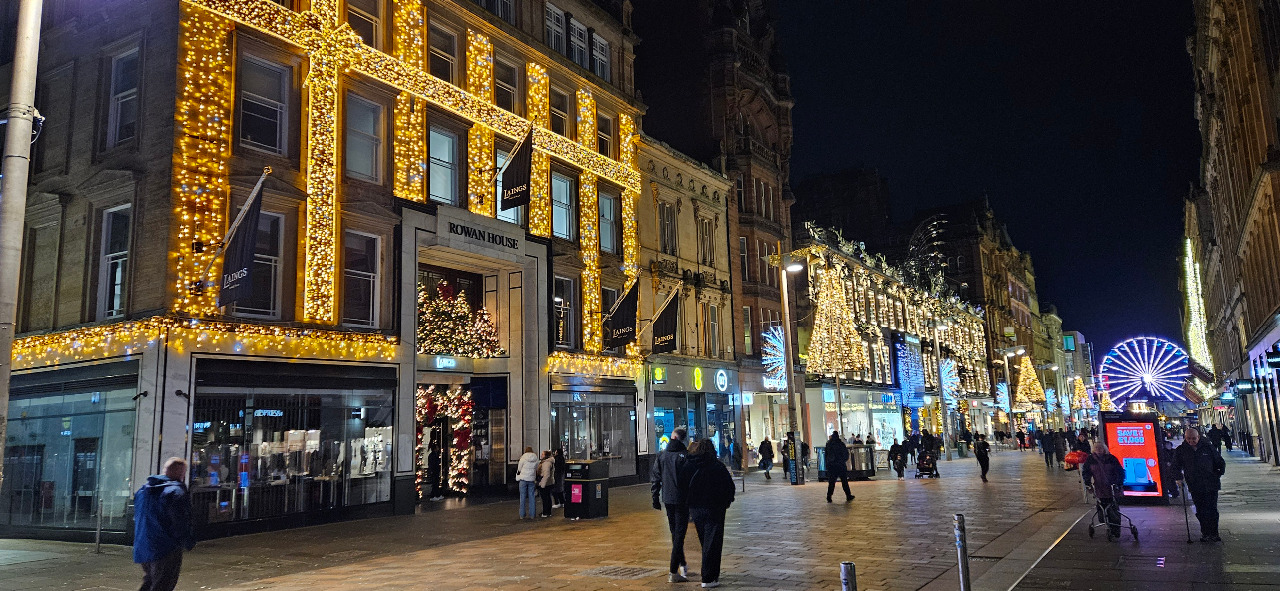 Die Jahreszeit brachte es mit sich, noch fünf Wochen bis Weihnachten. Also sind auch die Einkaufsstraßen dementsprechend dekoriert. Alles flinkert, flackert und leuchtet. Mehrmals mußte ich durch die Buchanan Street in Glasgow, ein Mal an einem Abend auf der Rückfahrt von Livingston. Und ich muss sagen, es war geschmackvoll, zumindest zum Teil.