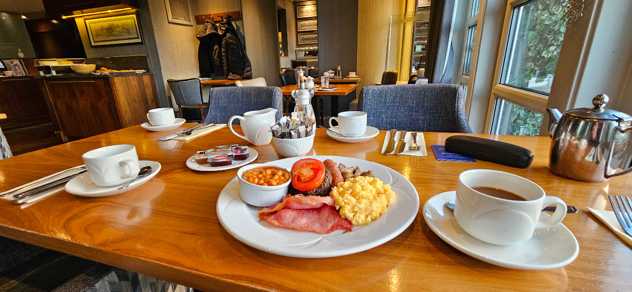 Das Frühstück hatte ich vorab NICHT mitgebucht. Beim Einchecken erkundigte ich mich nach dem Preis und bekam eine schockierende Antwort. Umgerechnet 24,-- €. Also habe ich zunächst nur für die erste Übernachtung das Frühstück mitgebucht. Später hat sich dann herausgestellt, dieser Preis galt für beide Übernachtungen. Ich hab diesen guten Mann schlichtweg nicht komplett richtig verstanden. Der Dialekt, unkonzentriert ... und überhaupt. Da wir wenig Gäste waren, war das eigentliche Buffet geschlossen, dort gab es aber trotzdem alles für ein "continental breakfast". Die junge Dame kam und ich bestellte natürlich die schottische Version, welche sich kaum vom Rest der Insel unterscheidet.