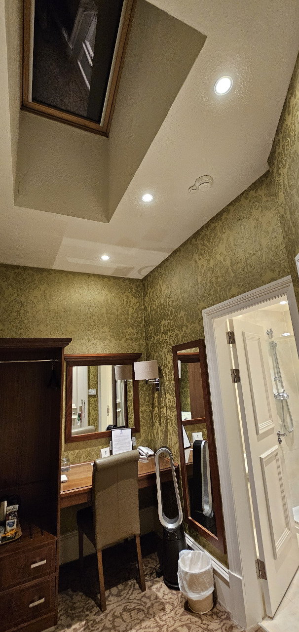 Beim Buchen der Zimmer hatte ich den günstigsten Preis gewählt. Leider war in der Beschreibung nicht erwähnt, dass das Zimmer KEIN Fenster hat. Eigentlich schon, aber es war eine Dachlucke, welche etwa fünf Meter über mir im Schrägdach eingebaut war. Man konnte per Fernbedienung öffnen, immerhin. So erinnerte das alles mehr an eine komfortable Gefängniszelle, als an ein Hotelzimmer.