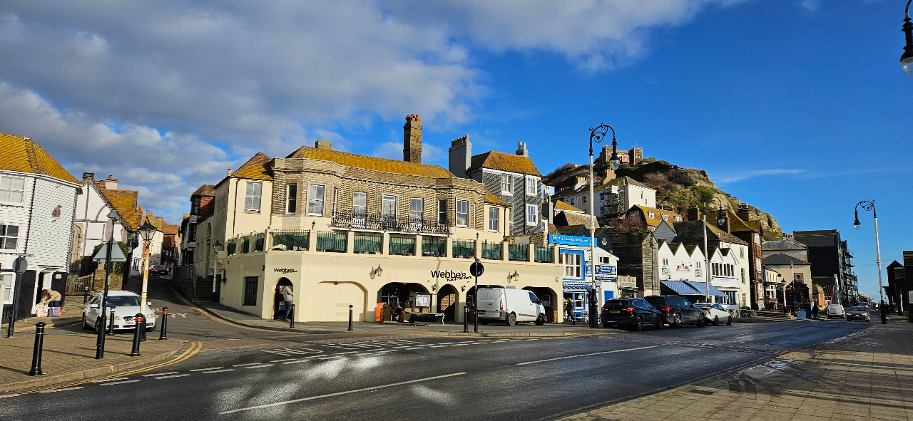 Ab diesem Punkt beginnt der nettere Teil. Hastings war schon recht früh eine Siedlung mit Hafen. Nach und nach verlor man aber an Bedeutung. Erst das Aufkommen des Tourismuses bescherte einen Aufschwung im 18. Jahrhundert, der Bauboom begann. Die Stadt liegt zwar direkt am Kanal, aber unmittelbar dahinter muss man die Klippen überwinden. Links oben die Überreste der normannischen Burg, darunter die Hotels aus der großen Zeit der inländischen Seebäder.