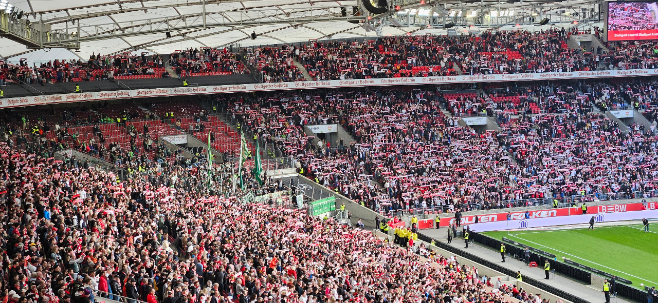 Also Wolfsburg braucht fast kein Mensch. So die Meinung vieler Fussballfreunde im Land. Also dieser Auswärtssupport scheint das zu bestätigen. Das bisschen Grün ging im roten Meer unter. Also falls Wolfsburg in der kommenden Saison nochmals im Neckarstadion auftaucht, reicht der obere Gästerang vollkommen aus. Dass die Leute in der Halbzeitpause ihren Support eingestellt und die Fahnen eingerollt haben, kann ich verstehen. Ich persönlich erinnere an das Jahr 2019 in Augsburg. Da lag Stuttgart nach einer ebenfalls desolaten Leistung zur Halbzeit auch mit 3:0 zurück, unser Commando Cannstatt räumte wutentbrannt den Gästeblock und fuhr in der Halbzeitpause heim. War dort. Wir verloren dann 6:0 (!) und der zweite Abstieg innerhalb kurzer Zeit war die Folge. Noch gar nicht mal so richtig lange her.