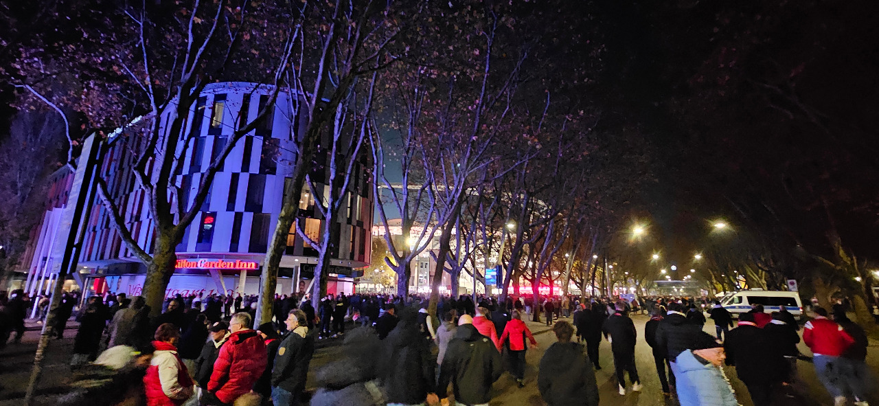 Vom Gästeanhang war ich enttäuscht. Ok, alle in schwarzer Kluft. Kein Banner, keine Zaunfahnen. Feyenoord ist anscheinend das Gegenstück zur bunten, fröhlichen Nationalmannschaft der Niederlande. Auch akkustisch blieb man schwach. Unverständlich wie bei einem Hochrisikospiel mehrere hundert Niederländer an Tickets neben dem Gästeblock bekommen, und dann noch als geschlossener Block.