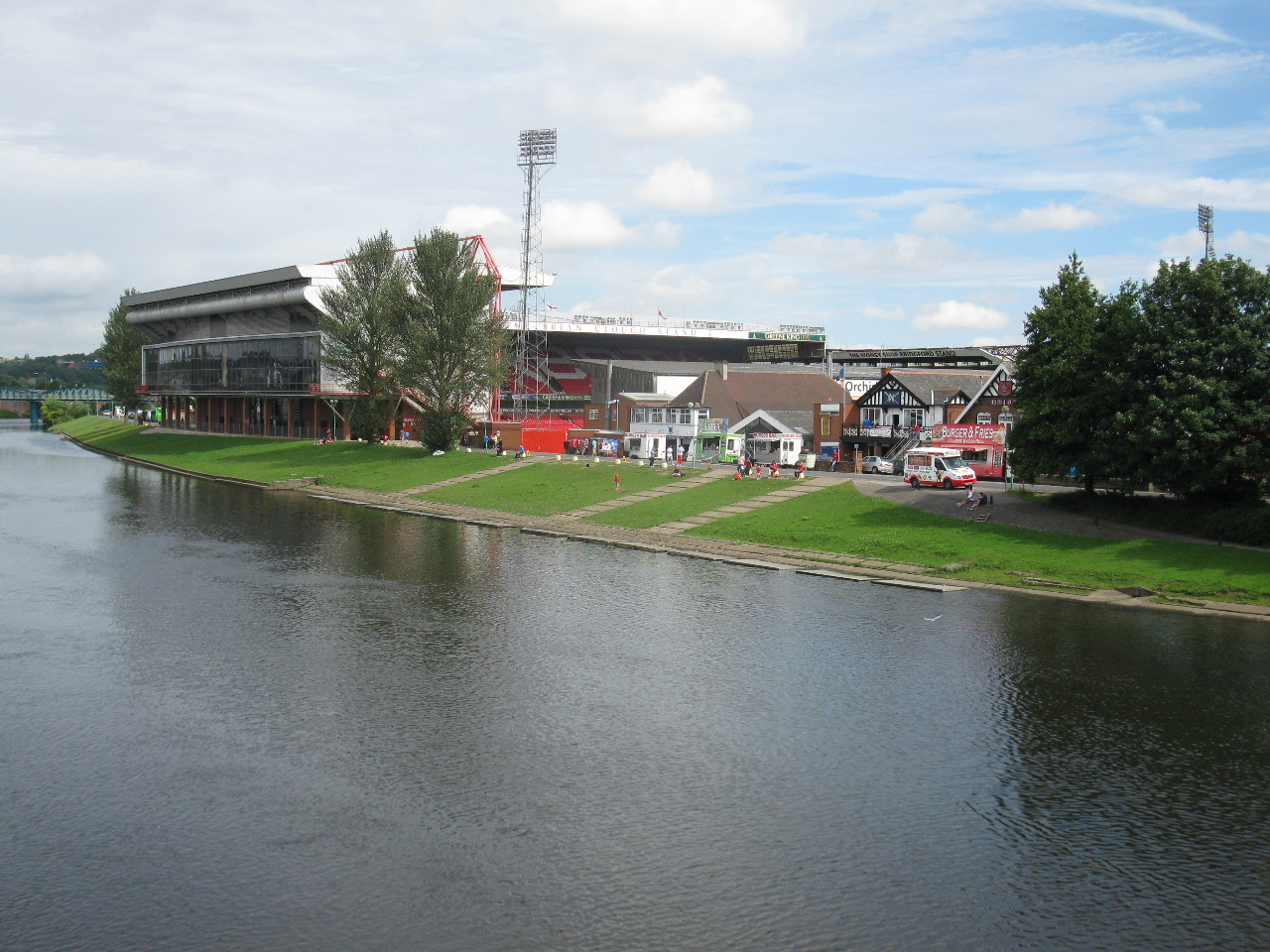 Dieses Bild kennt jeder, der vom Bahnhof aus zum Ground geht. Es sind nur zwei Kilometer und unterwegs kommt man auch an einem anderen Stadion vorbei, der Meadow Lane von Notts County. Es gibt große Pläne, erst am Anfang 2026 hat man grünes Licht bekommen. Man plant einen Ausbau auf maximal 50.000 Zuschauer. Im Moment gehen in den City Ground etwa 32.000 Besucher rein.