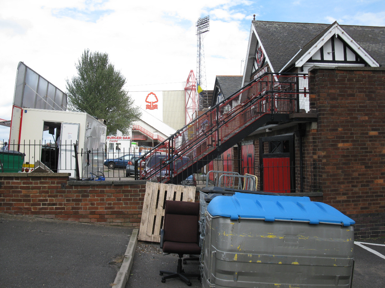 Zur Zeit ist der City Ground noch einer der wenigen, "old school" Footballgrounds in England. Da man ja direkt am River Trent ist, gibt es natürlich auch hier viele Ruderclubs. Und so bietet sich dieses Bild an einem Spieltag, nur drei Meter abseits der offiziellen Wege. Links die Hamburgerbuden und rechts die Aufgänge zu den "Vereinsheimen" der Ruderclubs.
