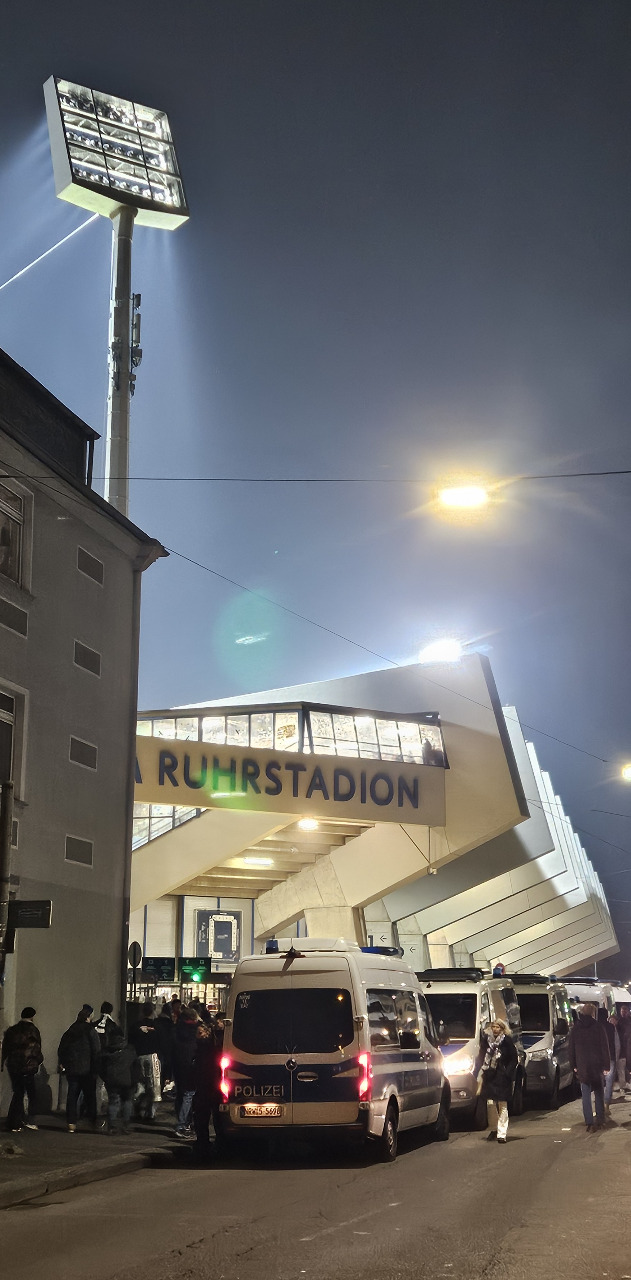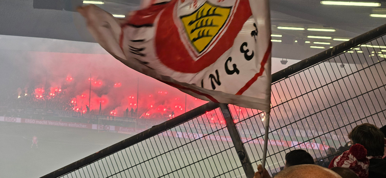 In der 48. Spielminute war der Drops gelutscht, das Viertelfinale so gut wie gesichert. Allen bösen Erfahrungen und Unkenrufen zum Trotz stellte sich der VfB Stuttgart anschließend nicht mehr so dämlich wie noch beim HSV an, als man ebenfalls in Überzahl sogar noch verlor. Diesmal wurde die ganze Pokalbegegnung erwachsen runtergespielt, ohne zu glänzen. Die Aufstellung war erneut geändert, die Spiele kommen in knüppeldicker Reihenfolge, ein Stress für Verein, Spieler und Fans. Trotz des vierten Auswärtsspieles in Serie war der Gästeblock erneut restlos ausverkauft und auch auf den anderen Tribünen sah man manchen Brustring blitzen. Irgendwie war es schon wie Ironie pur, mit dem Ende der freiwilligen Schweigepflicht des organisierten Supports fiel das 0:1. Bezeichnenderweise per Eigentor, ein Einwurf von Hendriks wurde unhaltbar ins lange Eck verlängert. Das spielte dem VfB in die Karten und der VfL Bochum konnte zwar weiterhin Nadelstiche setzen, aber so richtig überzeugend wirkten die Hausherren auch nicht. Stuttgart verwaltete jetzt schon und mit dem Kopfballtor von Undav unmittelbar nach Anpfiff zur zweiten Halbzeit war die Sache fast durch. Schließlich hatte sich der VfL schon selbst geschwächt, eine rote Karte in der 44. Minute wegen Notbremse als letzter Mann zog den Blauen zusätzlich den Stecker. Dann folgte das, was man sich eigentlich so wünscht. Mit dem notwendigen Ernst und Einsatz hielt der Bundesligist den letztjährigen Absteiger vom eigenen Tor fern und so richtig wild war man aber auf den dritten Treffer auch nicht. Dafür wurde weiterhin munter gewechselt, ja, ja, die vielen Spiele. Und so blieb es unterm Strich ein Match, das nicht gerade vor Spannung knisterte. Also damit und diesem 0:2 konnte ich persönlich gut leben. An diesem trockenen und frischen Abend im Westen, welcher angeblich vor Arbeit ganz grau ist.