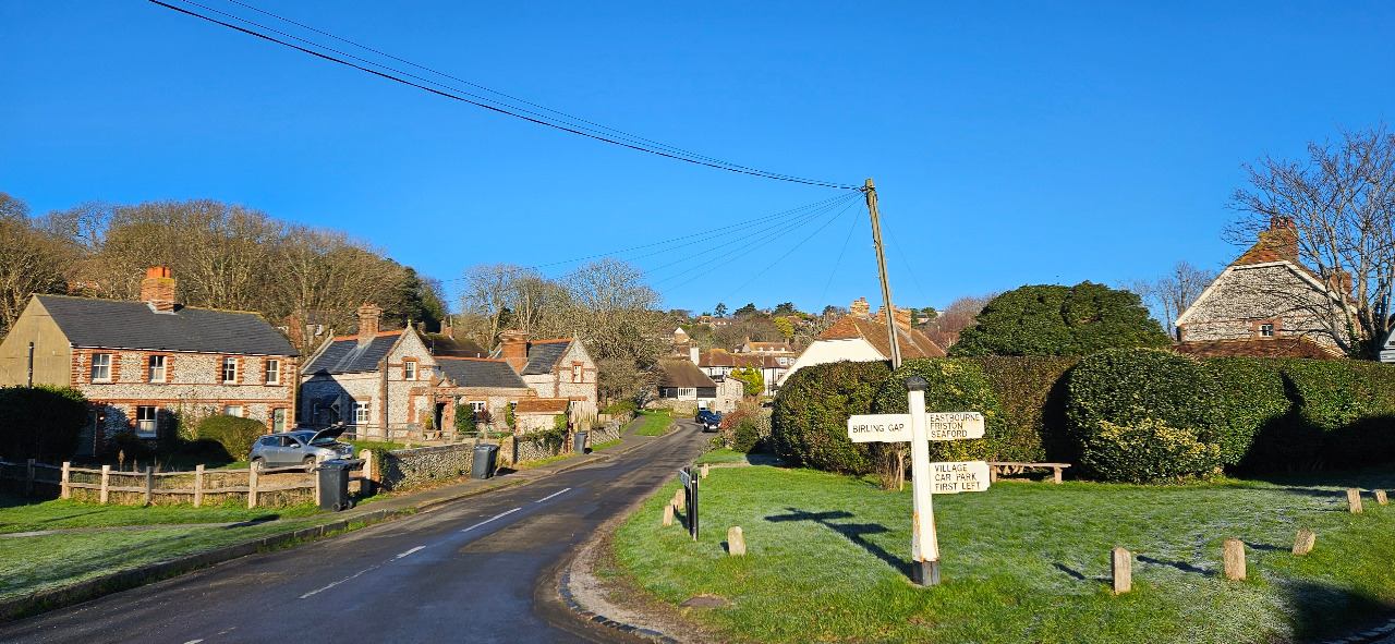 Der Januar gehört definitiv nicht dazu und so mußte ich den normalen Bus nehmen, in East Dean ging es raus. Allein dieser Ort an sich ist sehenswert, England aus dem Bilderbuch. Es war frostig, der Boden noch gefroren und ... absolut fabelhaftes Wetter. Traumhaft. Von wegen immer Nebel und Regen.