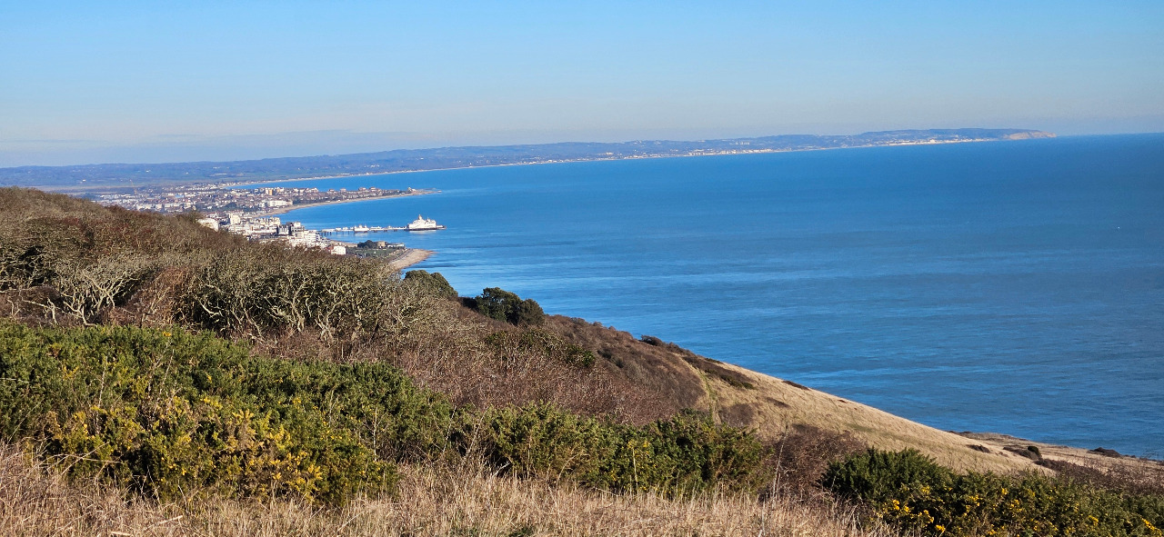 Ich habe fast unzählige Bilder gemacht, der strahlend blaue Himmel war unglaublich. Ich weiß, ich wiederhole mich. Hinter dem Beachy Head geht es dann etwas ums "Eck" und Eastbourne kommt in Sicht. Es führen mehrere Wege runter, ich nahm natürlich wieder einen etwas abenteuerlicheren Pfad, zum Schluß mußte ich durch eine Schafsweide. Aber es war ja gefrorener Boden. Grins.