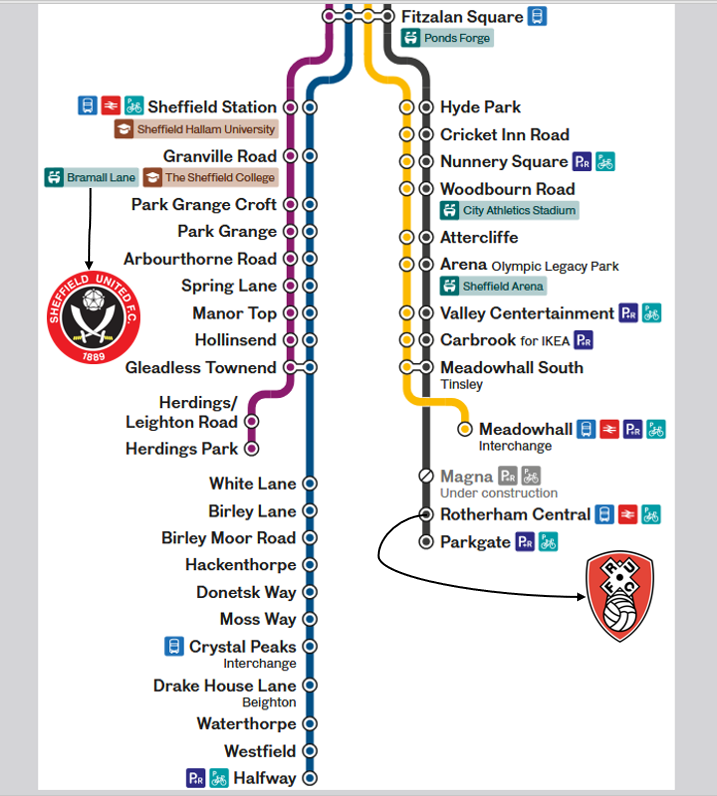 Also zur Bramall Lane zu gelangen, ist nicht ganz so gemütlich wie beim blauen Nachbarn. Es wird zwar die Haltestelle Granville Road ausgeschrieben, aber trotzdem ist es noch etwa eine Meile zu Fuß. Da kann man fast vom Bahnhof aus laufen. Der Ordnung halber habe ich noch das Vereinswappen von Rotherham United hinzugefügt. Die "Millers" stehen im Moment auf einem Abstiegsplatz runter in die vierte Liga, der Abstand zum rettenden Ufer ist eigentlich schon zu groß. Neun Punkte, allerdings noch zwei Nachholspiele in der Hinterhand.