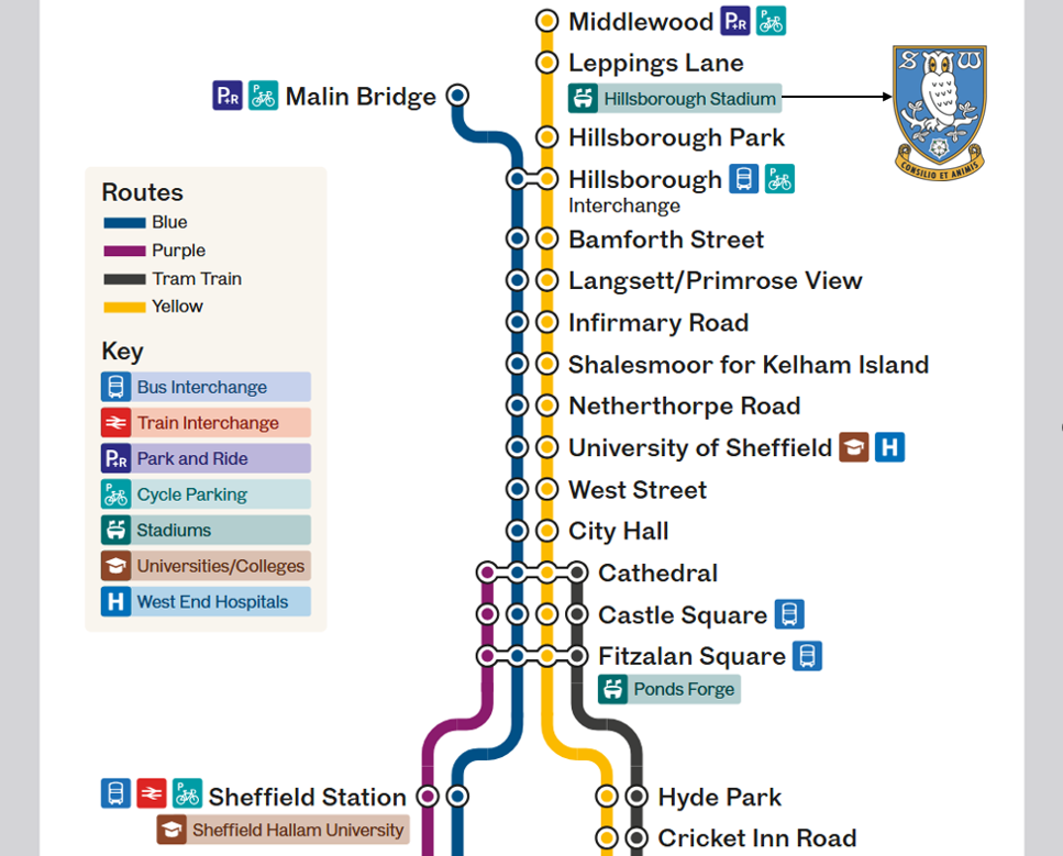 Der öffentliche Nahverkehr in Sheffield ist hervorragend ausgebaut, die Schwerlast trägt dabei die sogenannte Supertram. Insgesamt gibt es vier, farblich unterschiedliche Linien. Will man in das Hillsborough Stadium von Sheffield Wednesday, kann man vom Zentrum die gelbe Linie nehmen. Direkt vom Hauptbahnhof geht nicht. Castle Square und Cathedral sind auch das pulsierende Herz der Stadt und dann geht's in die Außenbezirke. Seltsamerweise liegen beide Clubs an den jeweiligen "Outskirts", jeder hat seinem eigenen Bereich.