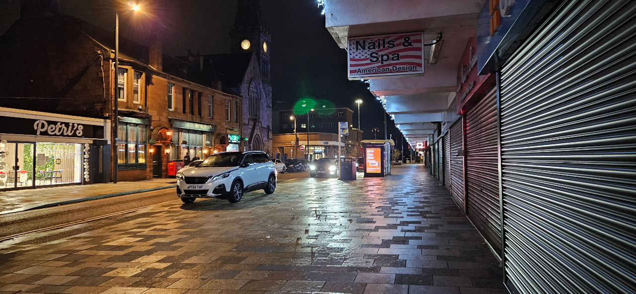 Es ist 18.00 Uhr in der Hauptstraße von Motherwell. Es gibt zwei Pubs hier, so zwei, drei Fastfoodläden. Alles ist verrammelt und verriegelt. Es hatte geregnet und die Straßen waren wie leergefegt. Selbst der Pub "The Brandon Works" war richtig leer. Irgendwie alles trostlos.
