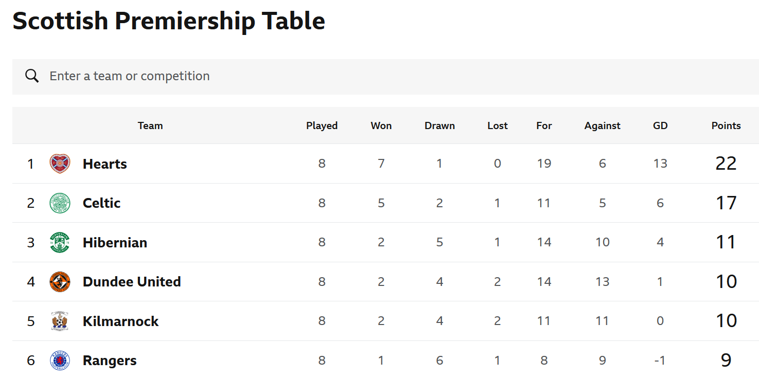 Aber im Land der Bravehearts könnte sich in dieser Saison eine Sensation anbahnen, es liegt was in der Lufts, es riecht nach Ablösung. Am achten Spieltag liegt nämlich nicht Celtic vorne, sondern die Heart of Midlothian aus Edinburgh. Allgemein nur Hearts genannt. Man hat schon fünf Punkte Vorsprung und das allein ist schon einige Schlagzeilen wert. Dazu kommt eine unerklärliche Krise der Rangers, schlappe neun Punkte aus acht Begegnungen, der Manager ist schon entlassen. Alles staunt und beginnt zu fragen, könnte zumindest in dieser Saison eine faustdicke Überraschung die ansonsten spannungslose schottische Premiership attraktiver machen. Oder ganz einfach: Packen es die Hearts? Eines scheint sicher, schlechter als Tabellenplatz zwei wäre schon eine Riesenenttäuschung. Siehe Tabelle:
