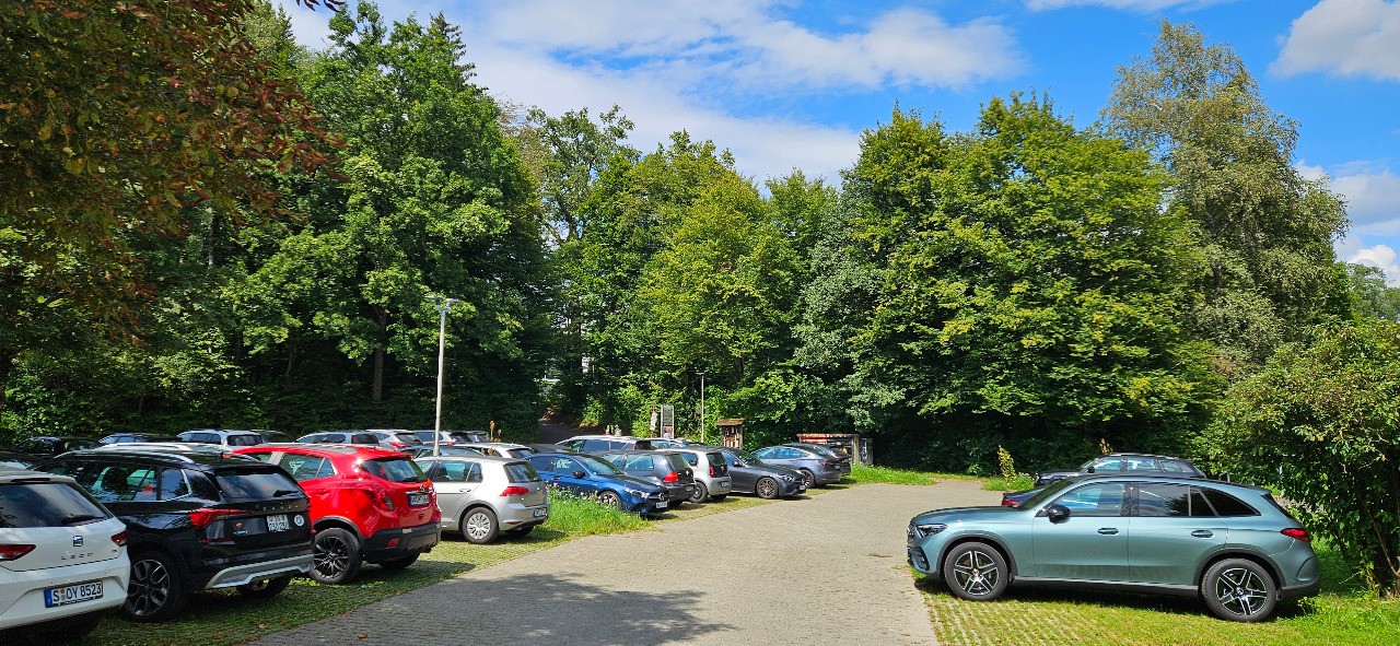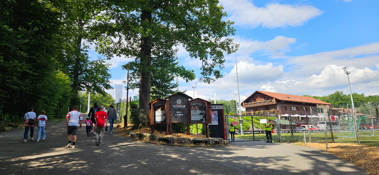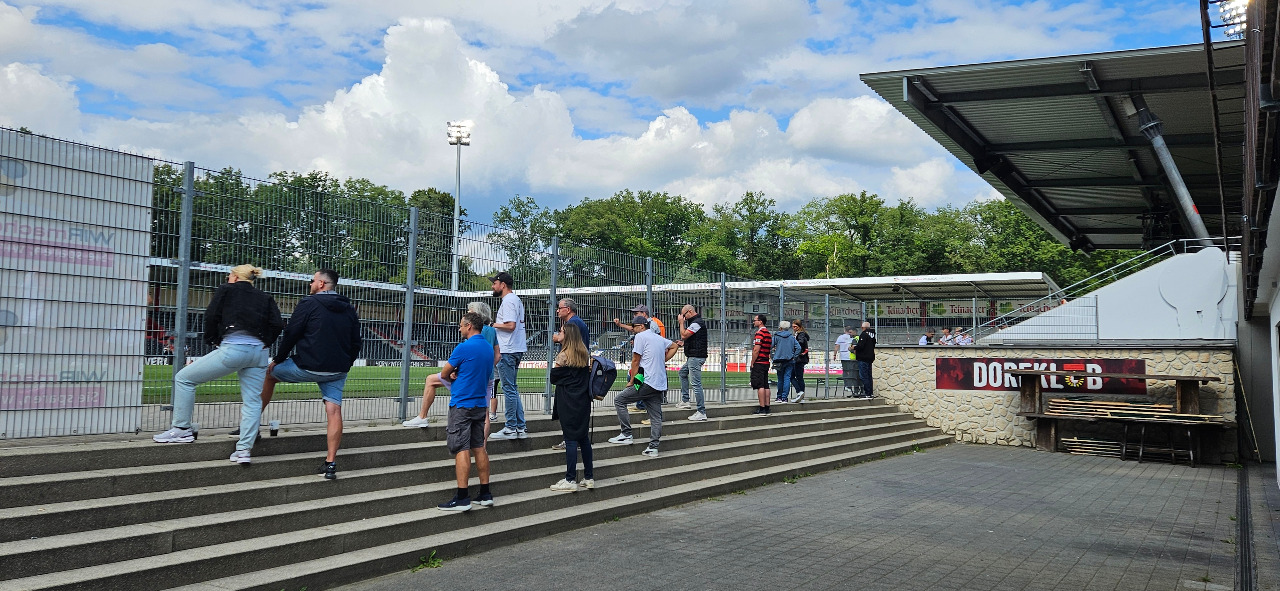 Das Stadion inmitten im Wald. Reizvoll, erholsam und schattig. Wenn nicht gerade die Zugpferde der 3. Liga kommen, reicht es völlig aus.