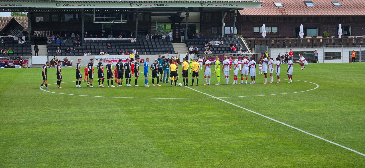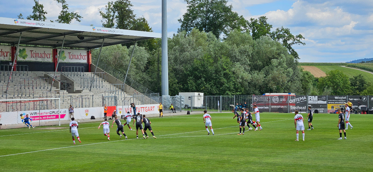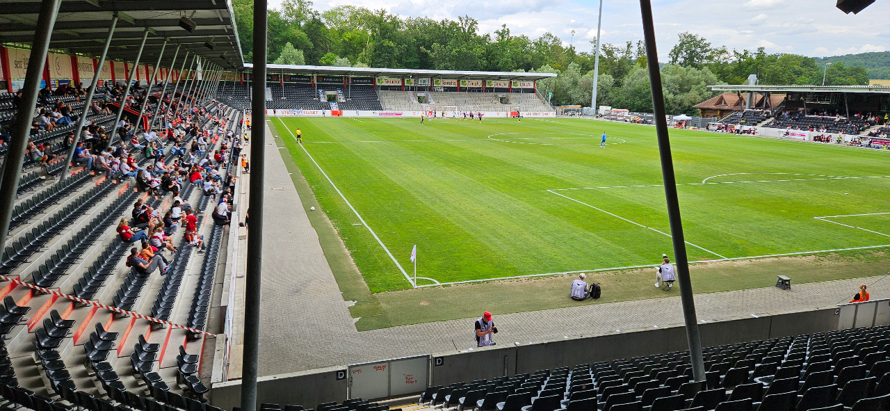 Hallo Bloggs. Die "Zweite" des VfB Stuttgart trägt ihre Heimspiele in der WIRmachenDRUCK Arena der SG Sonnenhof Großaspach aus, "Ground Sharing" heißt das auf Neudeutsch. Man könnte lästerweise auch behaupten, man versteckt sich im Wald. Denn idyllisch ist es schon, dort am Allmersbach. Also der Standort ist absolut nicht fußballgerecht und gerade deshalb hat das ansonsten recht nette Stadion seinen absoluten Reiz. Also für die wenigen Zuschauer ist es ideal, man hat kaum Parkplatzprobleme, nach einem nervenaufreibenden Match ist ein Spaziergang durch das beruhigende Grün des Waldes oftmals Balsam für die Seele. Nicht umsonst schmückt sich der Eigentümerverein mit dem Beinamen "Dorfclub". Hier trifft es voll und ganz zu.